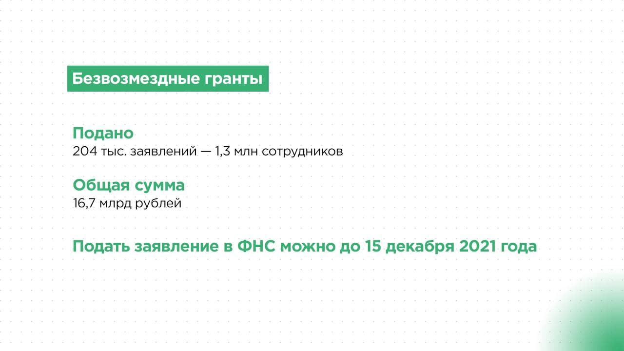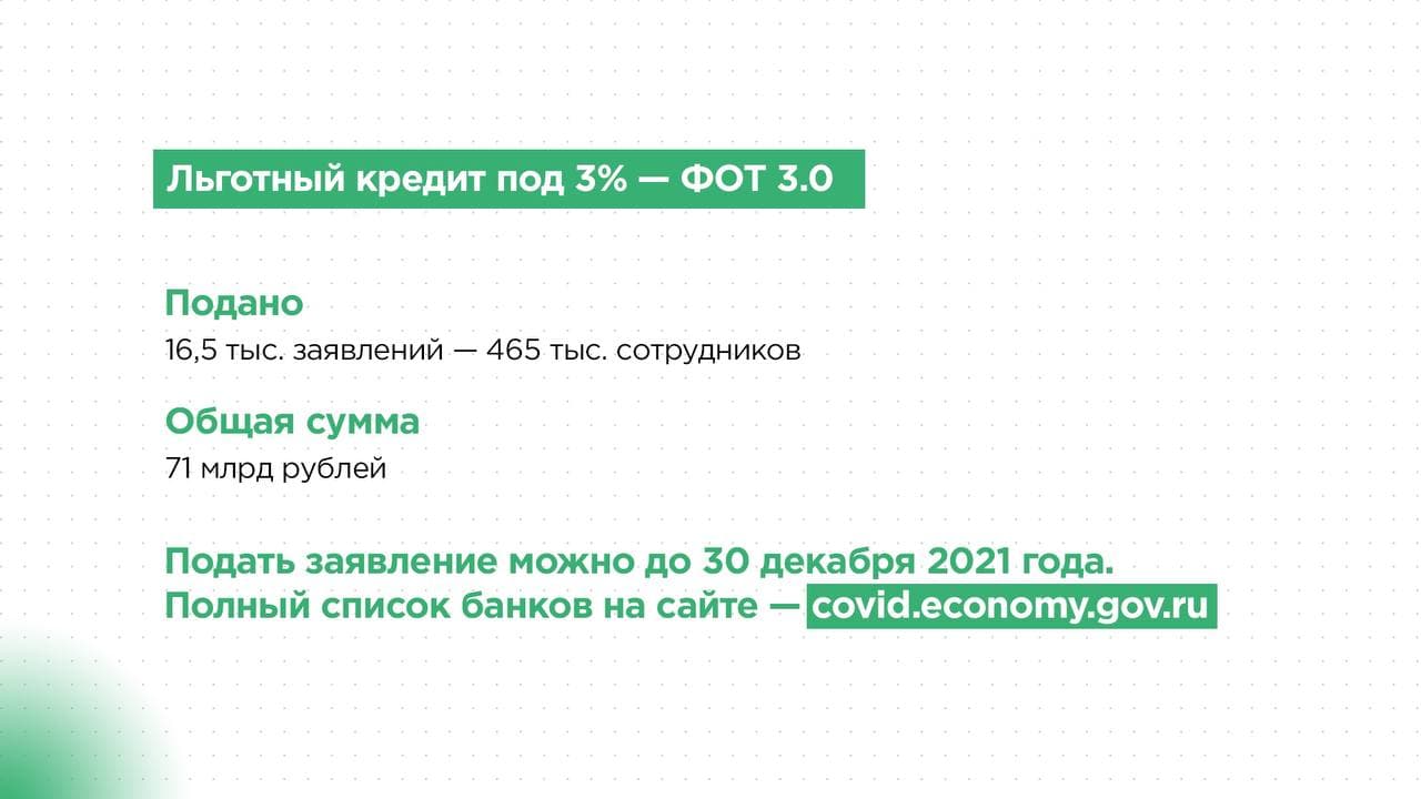 Напоминаем, что предприниматели ещё могут подать заявление: безвозмездный грант — в ФНС до 15 декабря, льготный кредит «ФОТ 3.0» — в банки до 30 декабря. Полный список банков и условия получения — на сайте covid.economy.gov.ru
