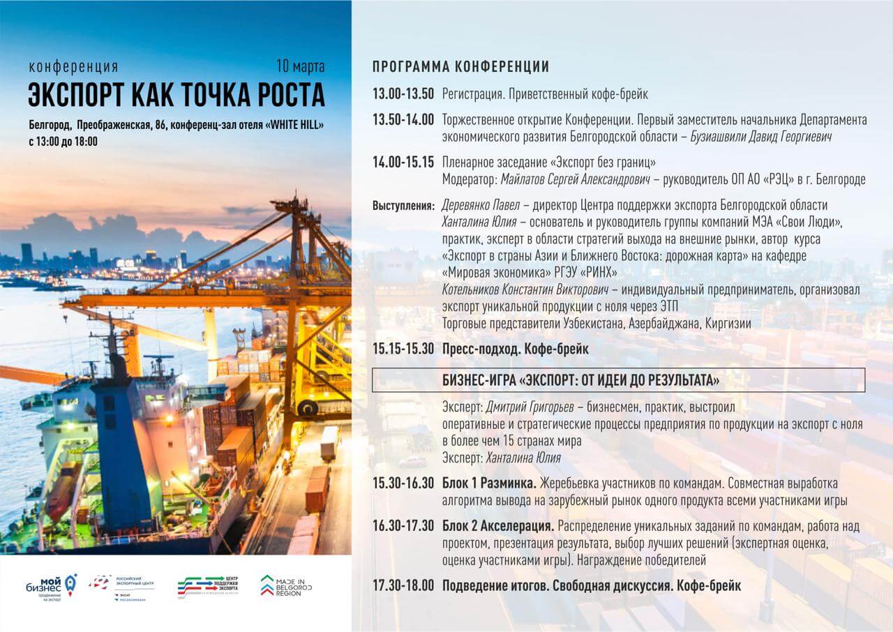 Мероприятие будет интересно как опытным экспортерам, так и тем, кто только планирует экспортную деятельность. Практическая часть конференции пройдет в формате бизнес-игры «Экспорт: от идеи до результата», которая позволит прокачать компетенции, необходимые для начала и дальнейшего расширения экспортной деятельности. Начинающие экспортеры получат алгоритм выхода на зарубежные рынки.