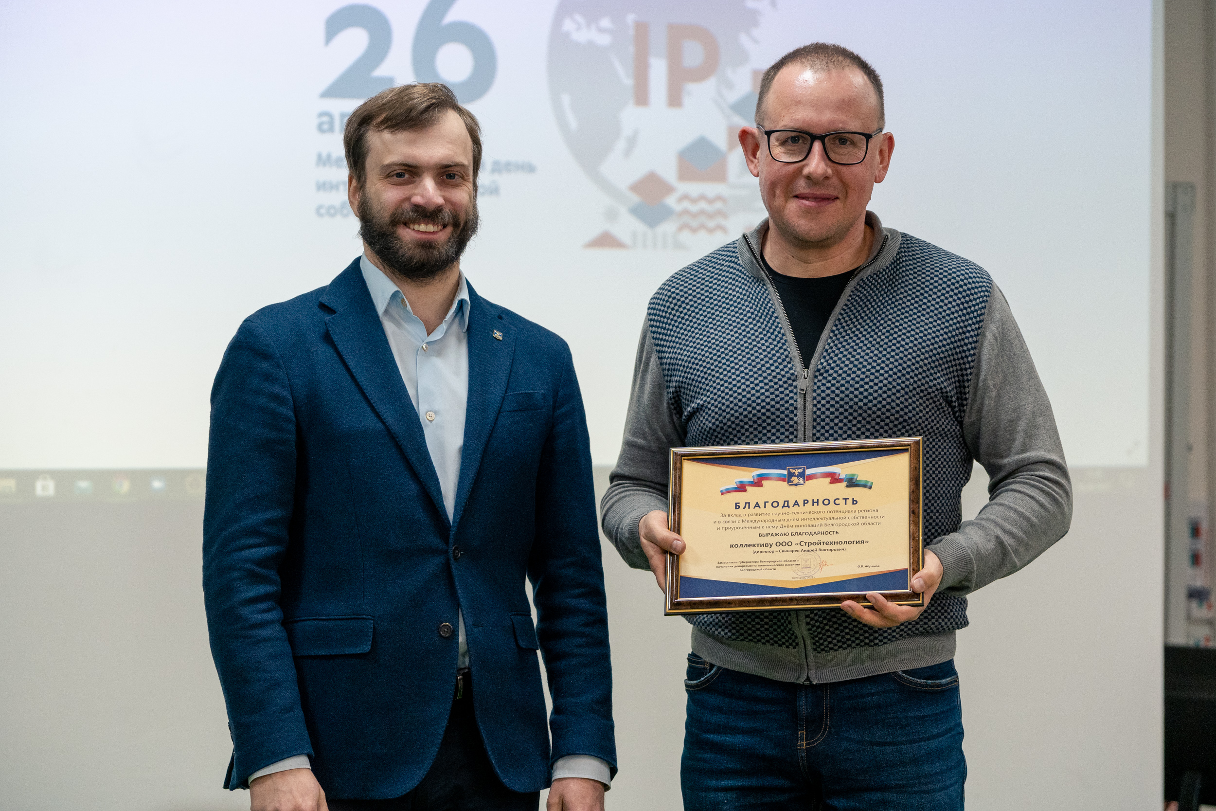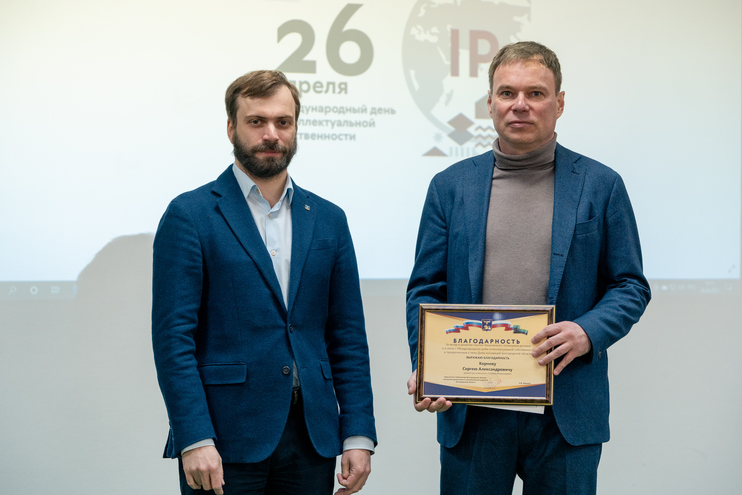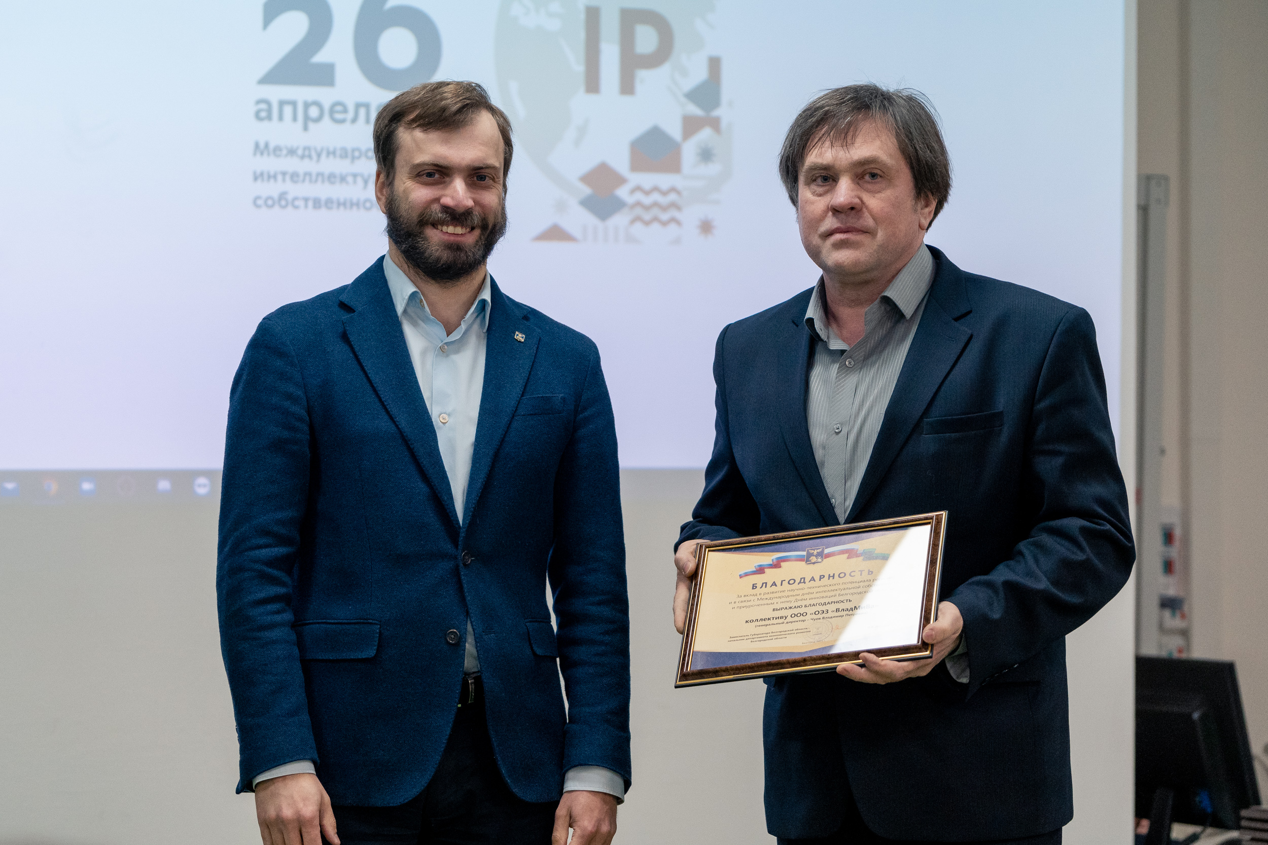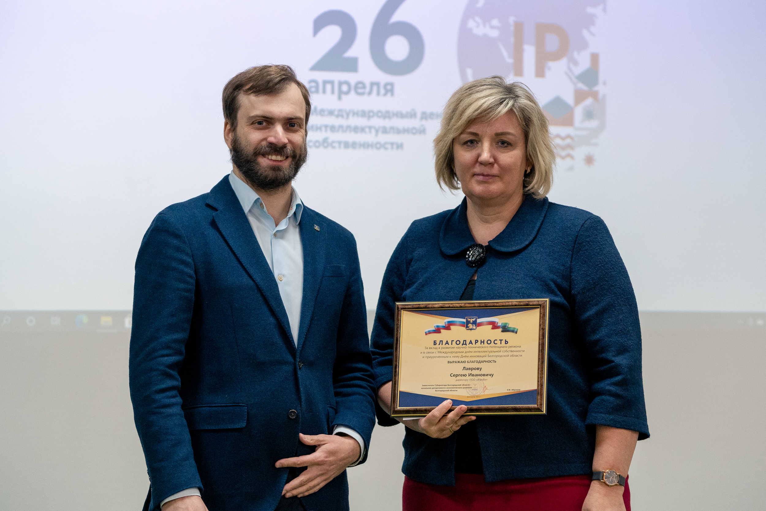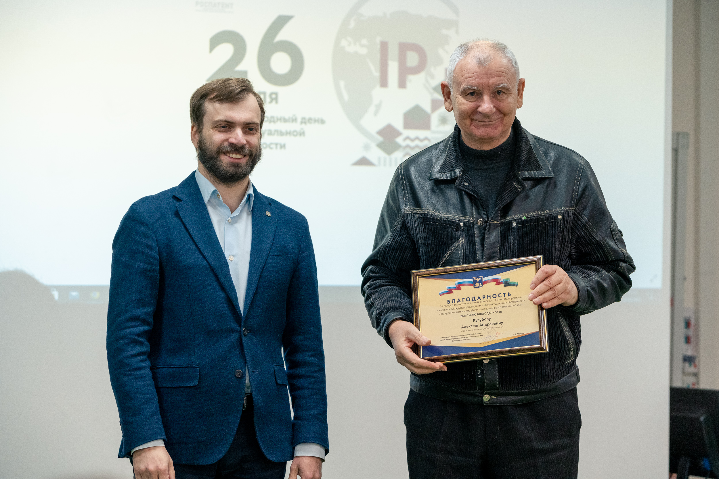 Первый заместитель начальника департамента экономического развития области Давид Георгиевич Бузиашвили выступил с приветственным словом, в котором отметил усиление роли интеллектуальной собственности в социально-экономическом развитии общества и постоянно возрастающую необходимость в патентной охране научно-технических достижений, а также вручил благодарности департамента экономического развития области.